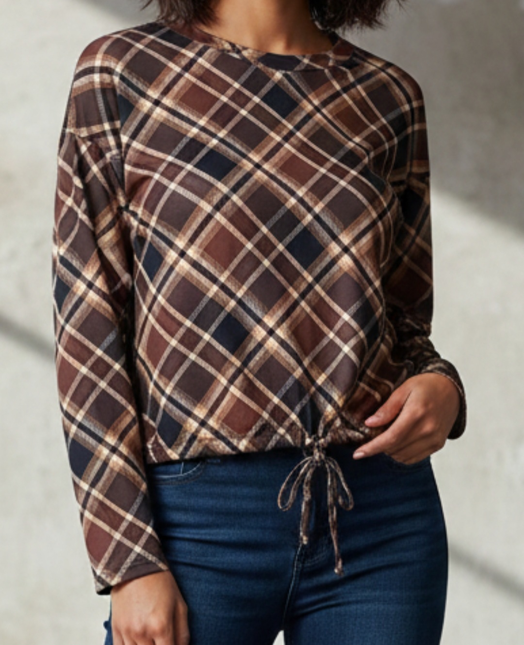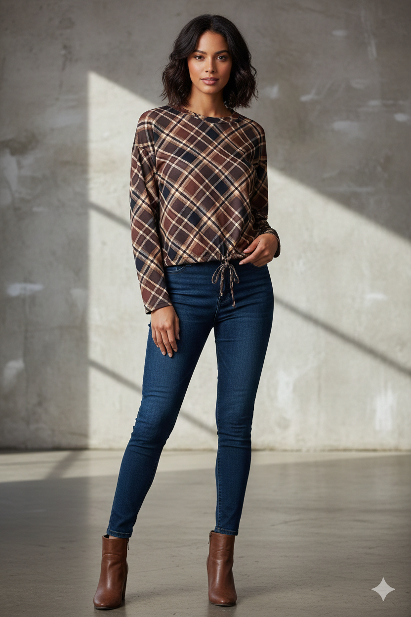 - Patrón: Cuenta con un estampado de cuadros (plaid) en disposición diagonal, lo que le da un toque dinámico frente al cuadro tradicional.