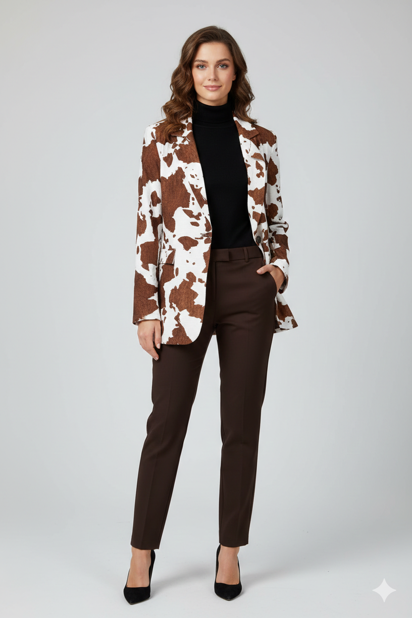 Esta americana destaca por su llamativo estampado animal de vaca en tonos marrón chocolate y blanco, una tendencia audaz que aporta un aire moderno y sofisticado a cualquier conjunto.