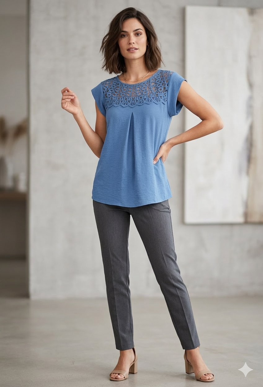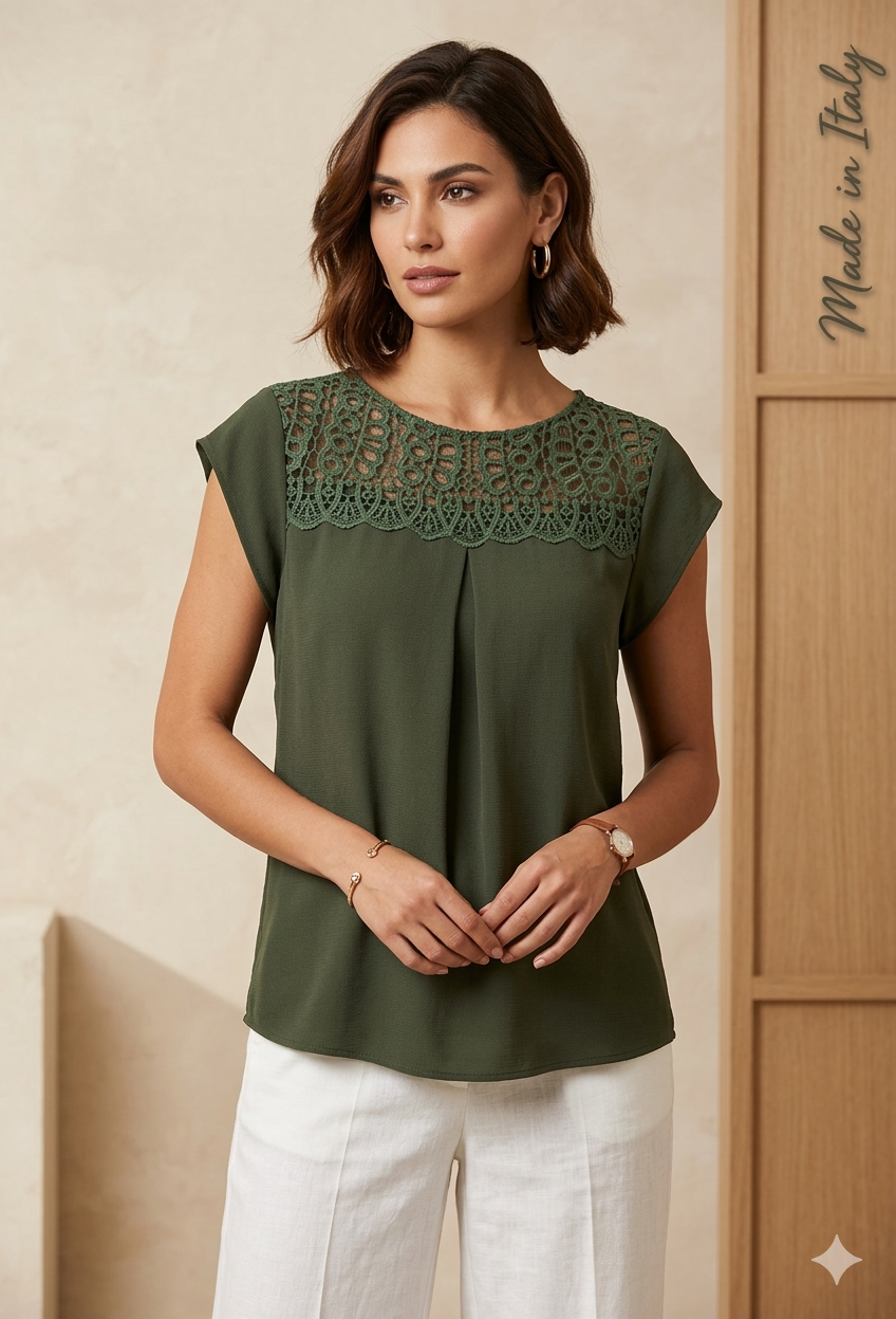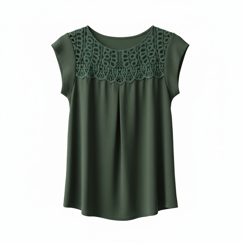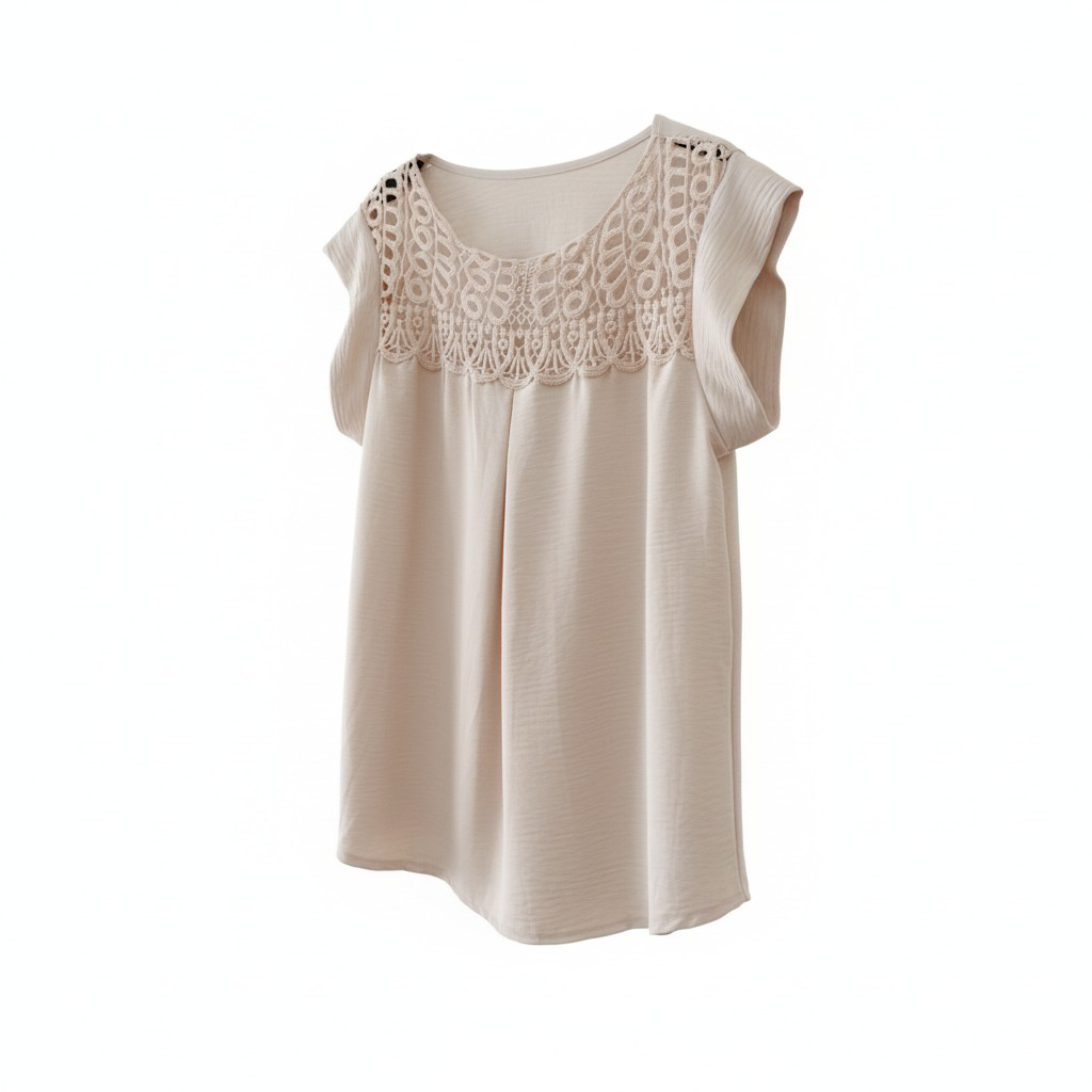 Detalle Principal: El canesú delantero está adornado con un encaje de guipur o crochet con motivos circulares y florales. Este detalle crea una sutil transparencia en la zona de las clavículas y los hombros.