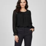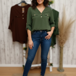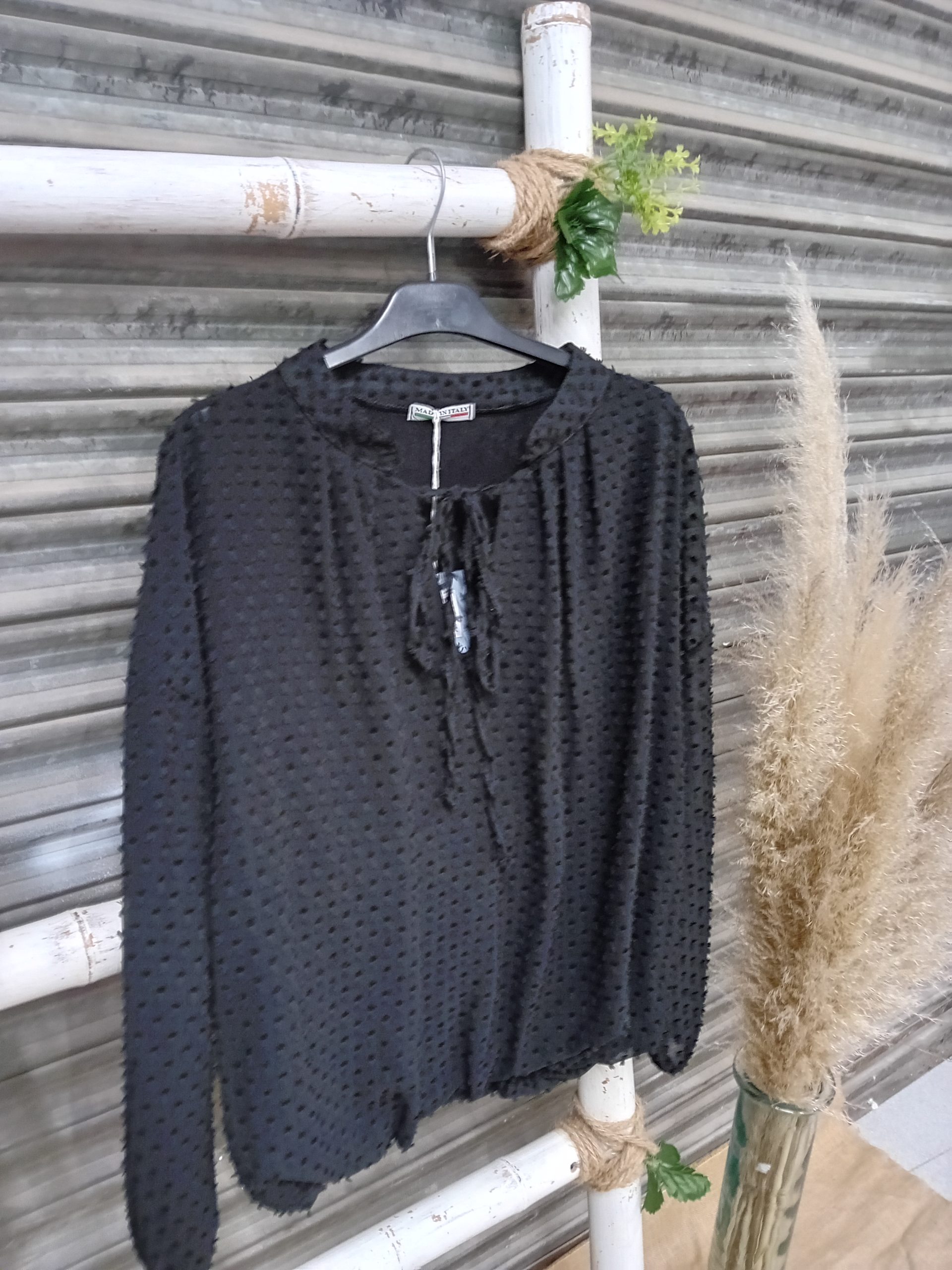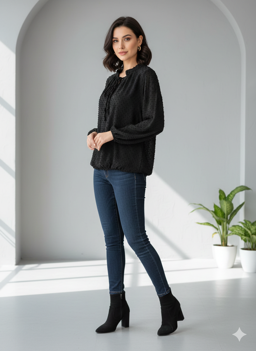 Blusa presenta un diseño ligero y romántico con detalles de textura sutiles
