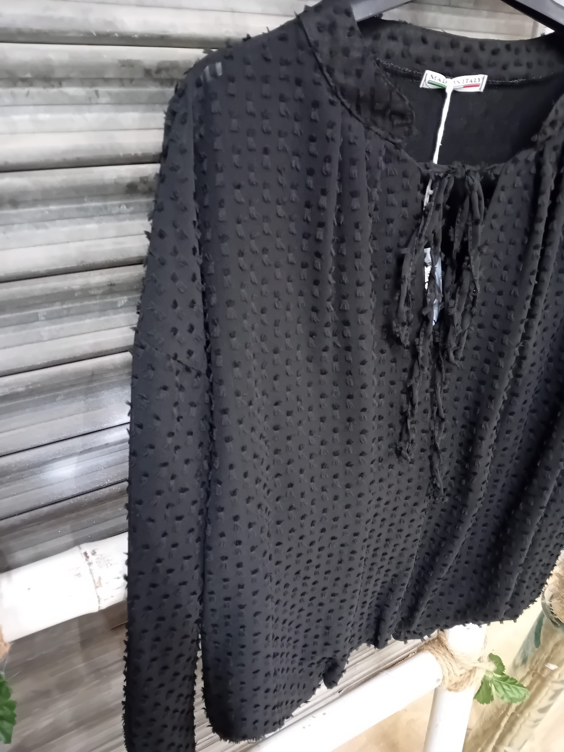 - Tejido: Está confeccionada en una tela translúcida que presenta el efecto «plumeti» o puntos suizos (pequeños lunares en relieve del mismo color que la prenda).