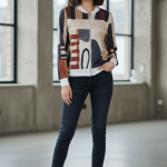 - Patrón Geométrico: Presenta un estampado artístico con formas abstractas y circulares de gran tamaño.