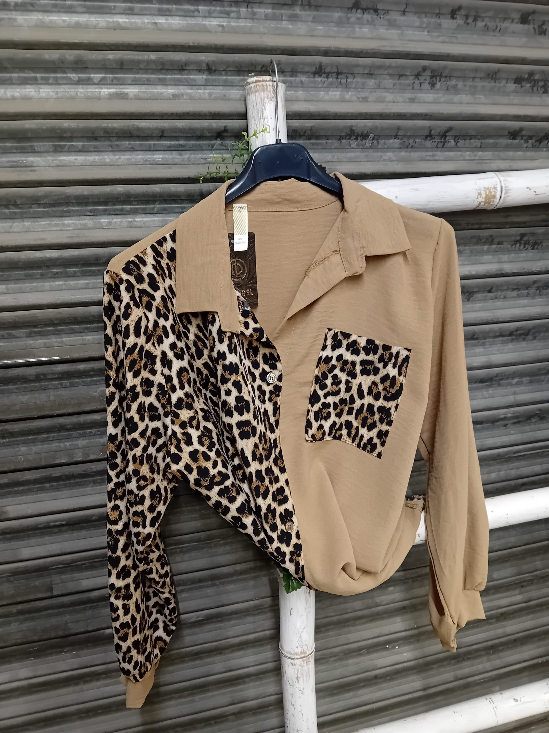 - Estilo Bicolor y Mixto: La prenda está dividida verticalmente. El lado derecho (desde la perspectiva del espectador) muestra un estampado animal (leopard print) clásico en tonos tierra y negro, mientras que el lado izquierdo es de un color camel o beige sólido.