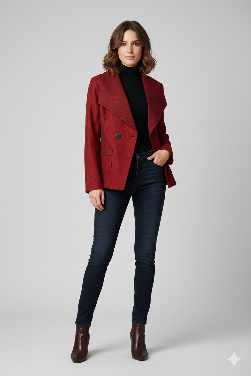 - Color y Material: Presenta un tono rojo oscuro o granate con una textura que parece ser de lana o mezcla fina.