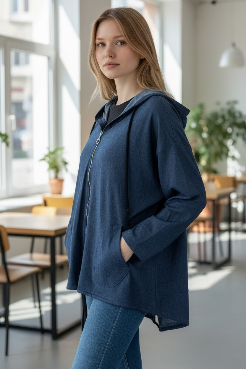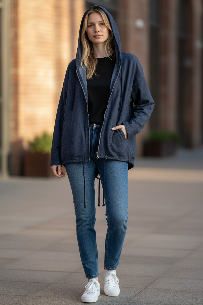 - Capucha: Incluye una capucha amplia integrada que mantiene la misma línea fluida de la prenda.