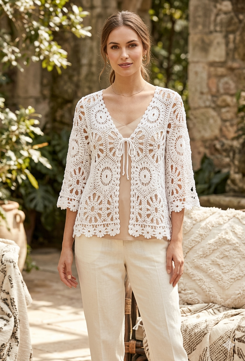 Chaqueta de estilo bohemio y romántico, ideal para complemento ligero. Aquí tienes una descripción detallada de sus características: