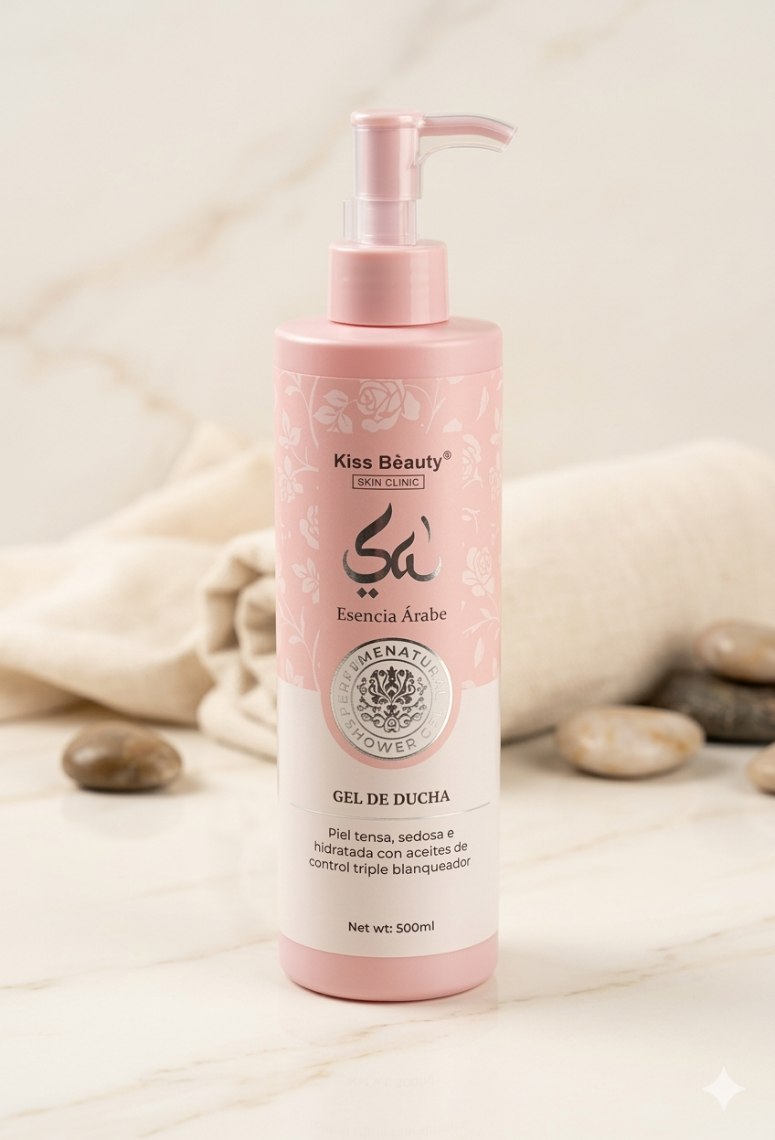 Gel de Ducha de la marca Kiss Beauty (bajo su línea Skin Clinic), diseñado con un enfoque en la estética y fragancia de inspiración árabe.