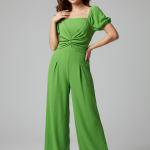 ​Pantalón: De corte palazzo o pierna ancha, lo que proporciona movimiento y una caída fluida hasta los pies.