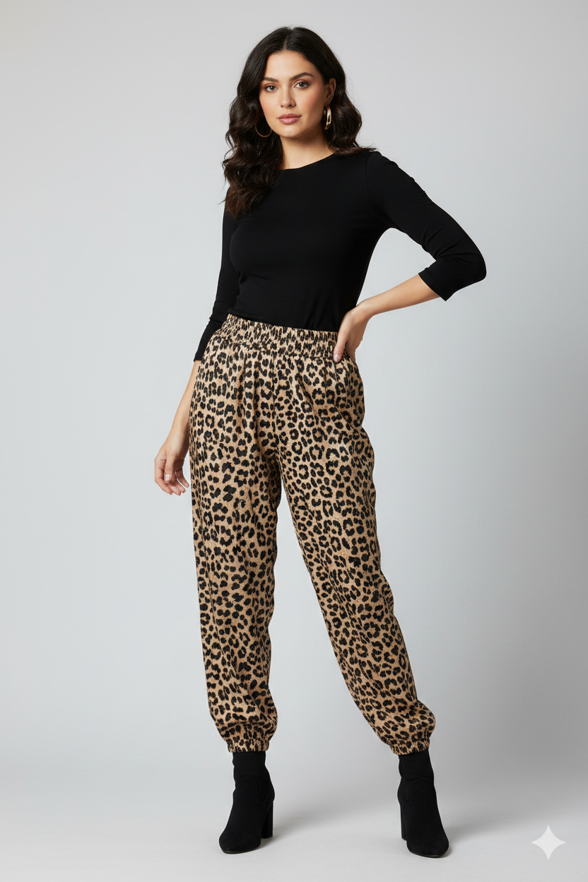 - Pantalon (estampado de leopardo) en tonos clásicos: marrón, beige y negro.