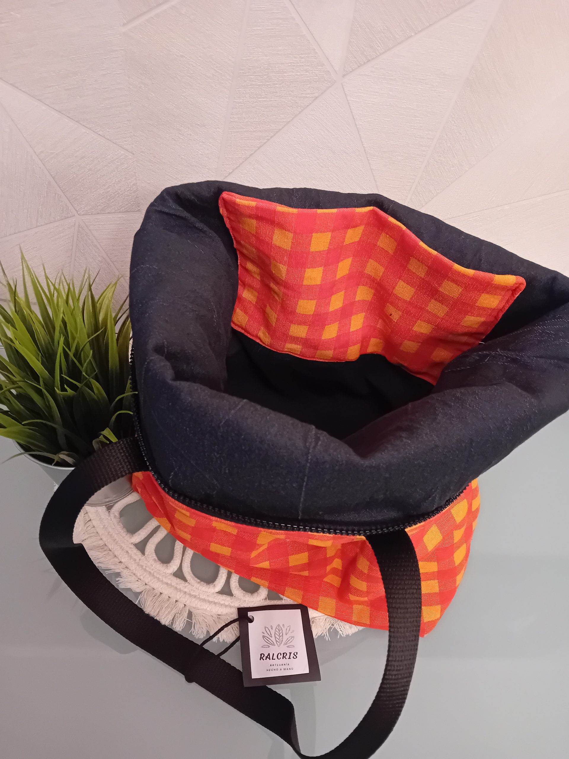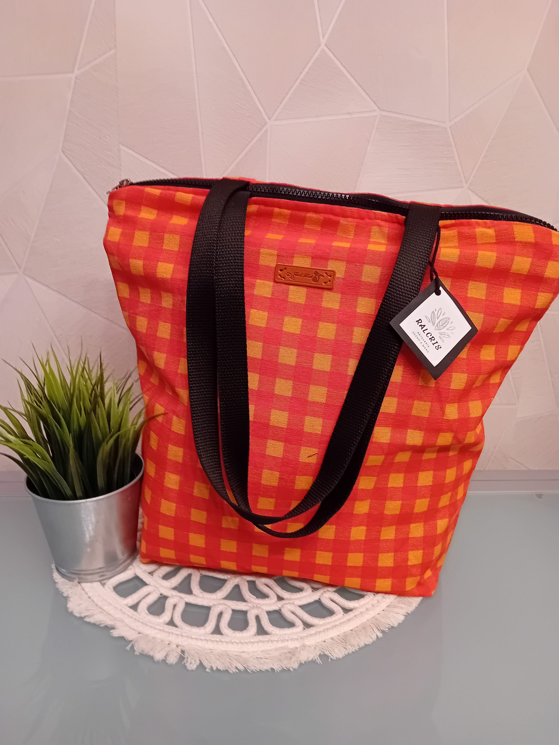 Totebag cuadros vichy, interior con bolsillo, asas de naylon reformadas y cierre de cremallera.