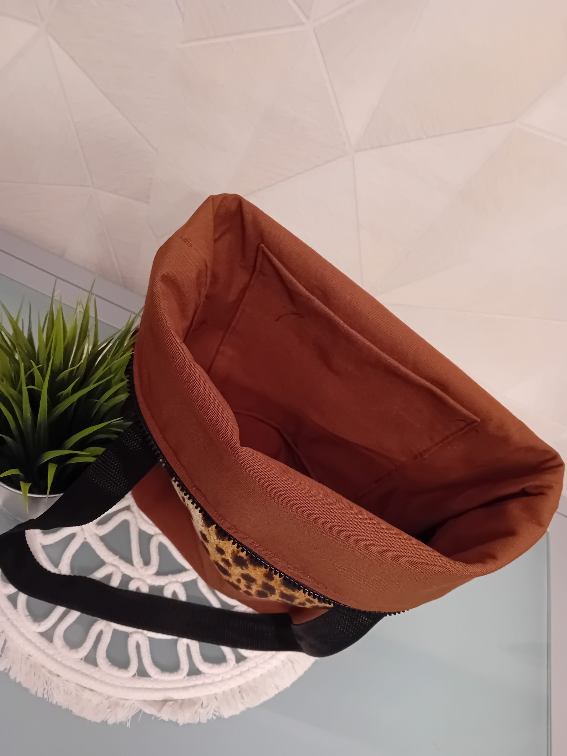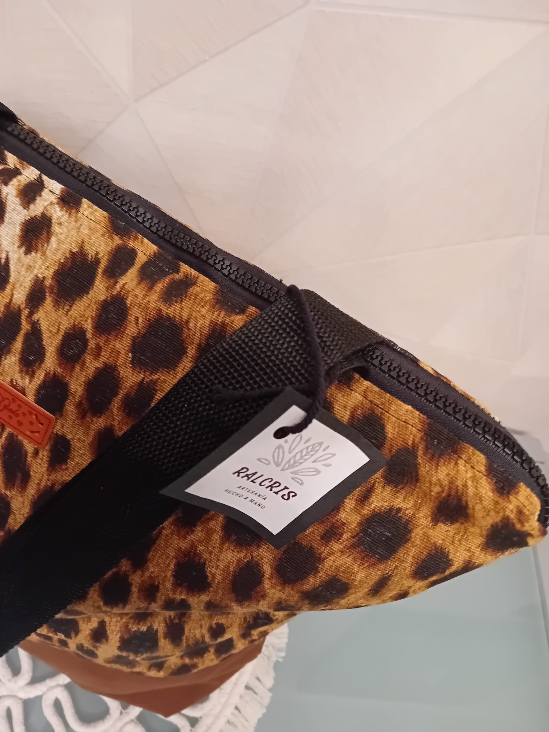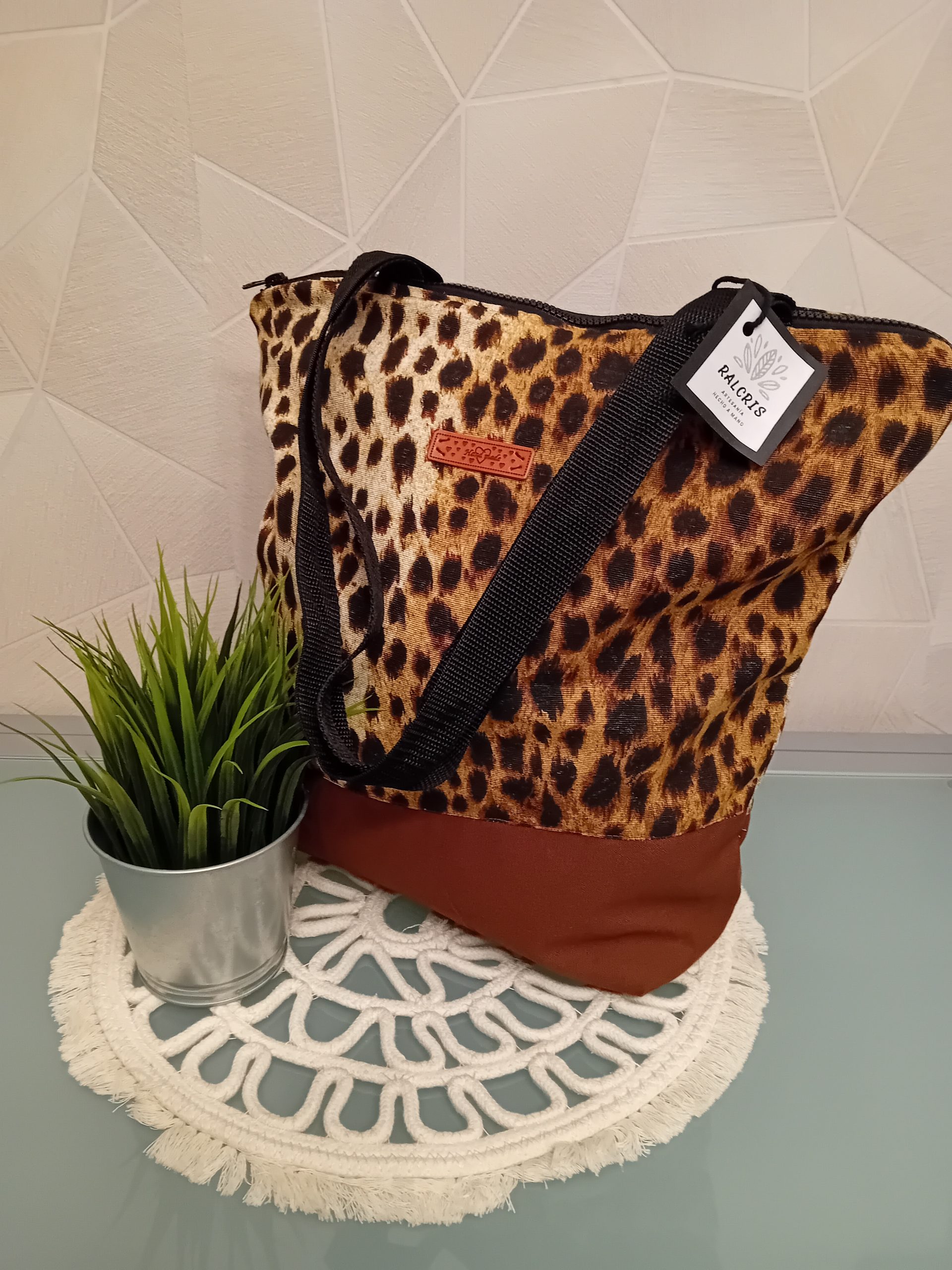 Totebag artesanal, estampado animal print, cierre de cremallera y asas reforfadas.