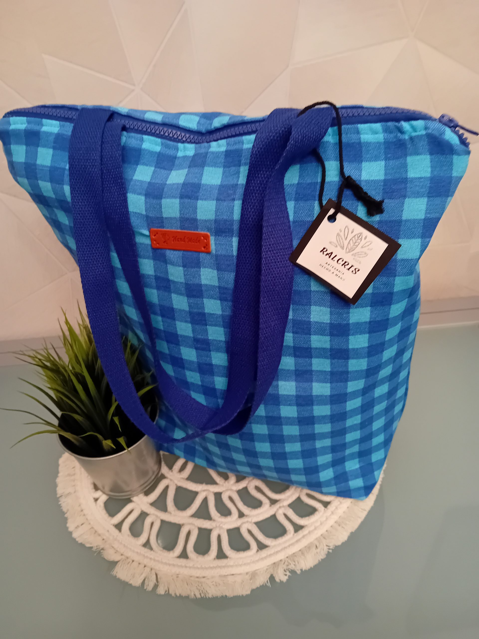 Totebag personizada hecha a mano, diseño cuadros vichy azul, forrada por dentro con bolsillo y cierre de cremallera, asas azul reforzada.