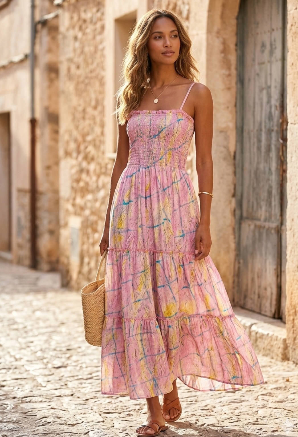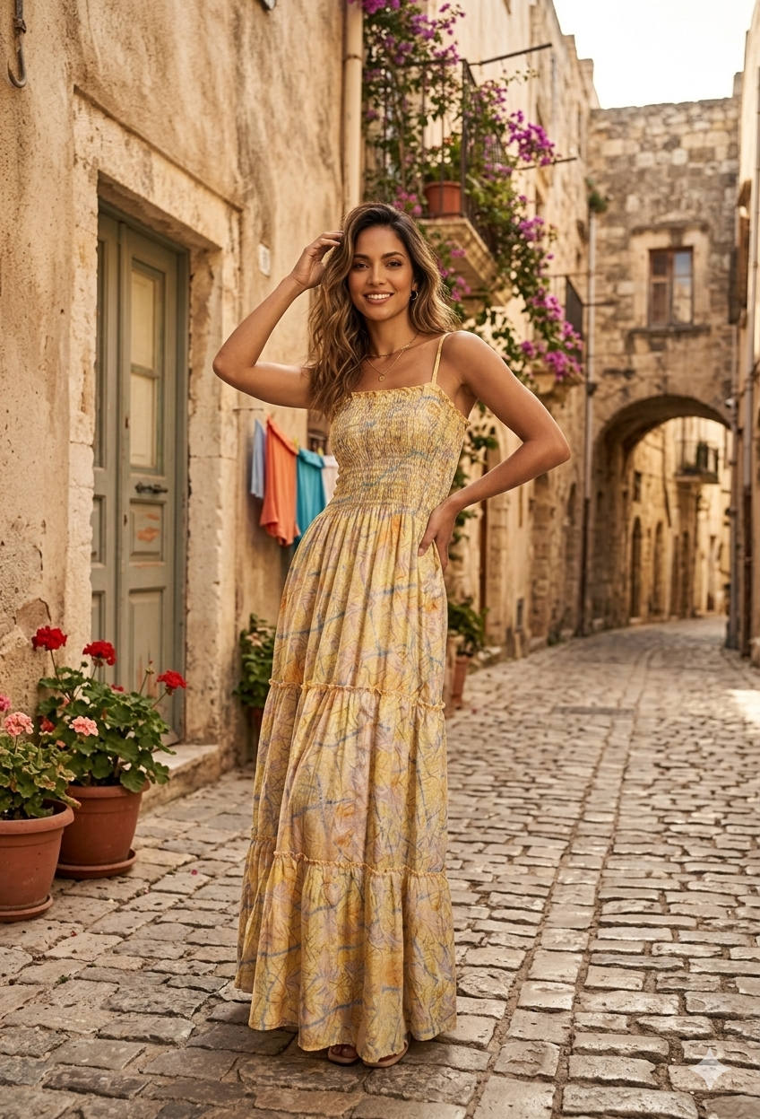 - Corte: Se trata de un vestido largo (maxi) con una silueta fluida y relajada.