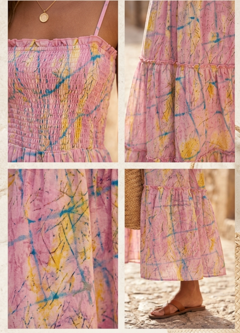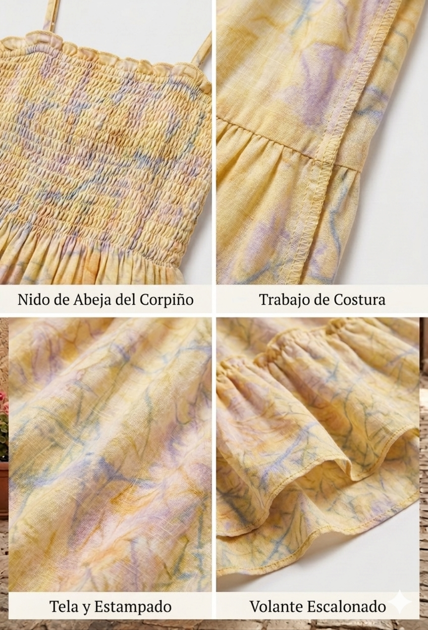 - Cuerpo (Top): Presenta un diseño tipo «smocked» (nido de abeja) en el torso, lo que permite que la tela se ajuste elásticamente al cuerpo de forma cómoda.