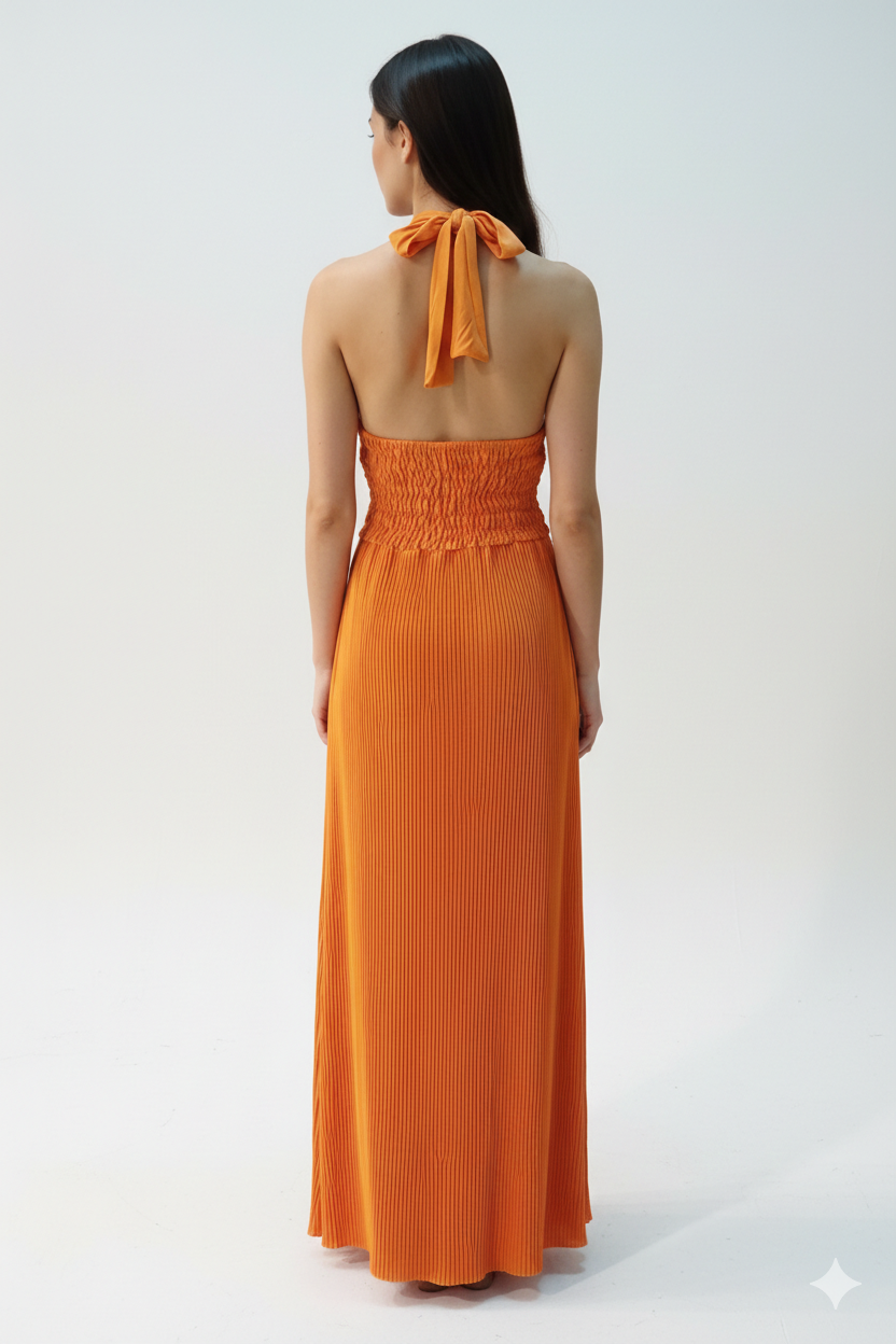 - Textura: Todo el vestido está confeccionado en una tela con plisado micro-acordeón (vertically pleated), lo que añade dimensión visual y una textura rica al diseño.