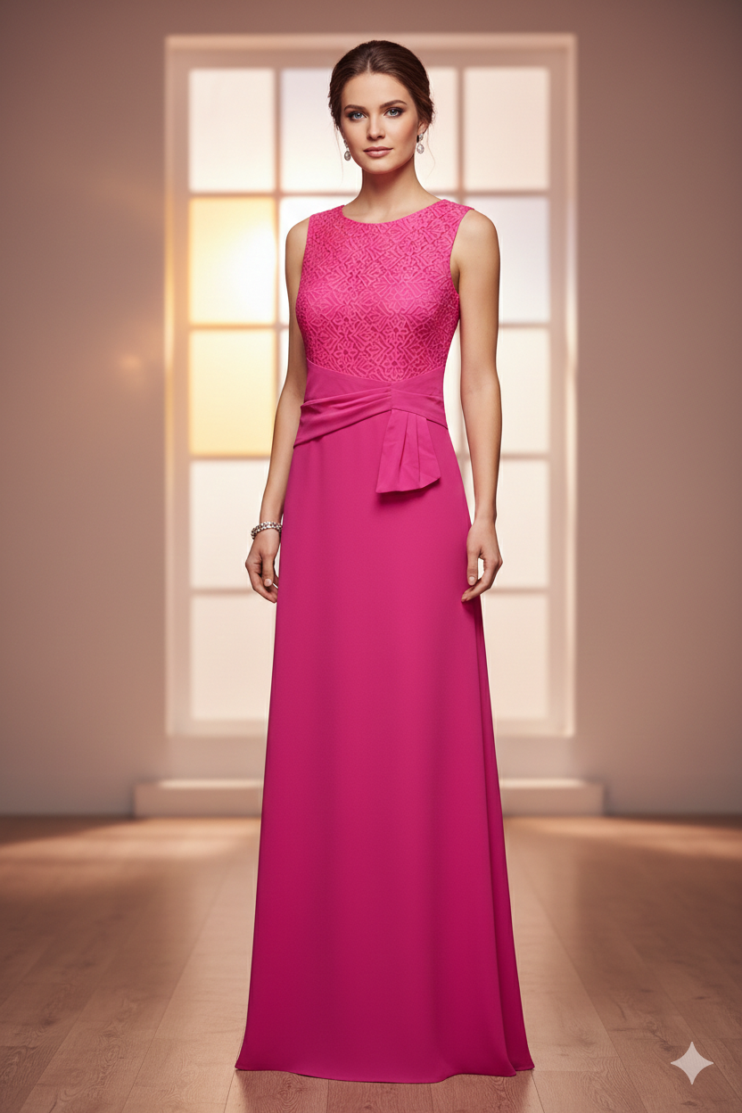 - Escote y Cuerpo: Presenta un escote redondo (tipo joya) y un diseño sin mangas. La parte superior está confeccionada en un encaje o guipur con patrones geométricos, lo que aporta textura y un toque de sofisticación.