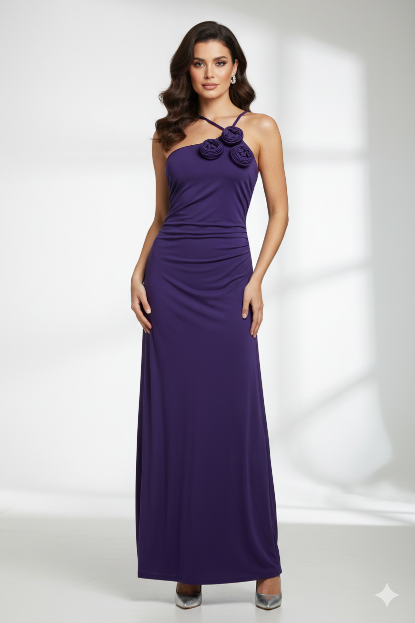 - Corte: Silueta ajustada al cuerpo que se extiende hasta el suelo (longitud maxi), resaltando la figura de forma fluida.