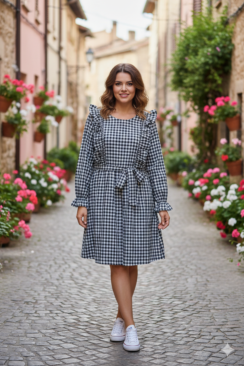 Vestido de corte cintura , con volantes estampado de cuadros vichy.