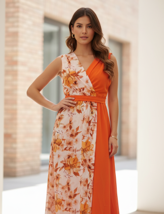 24,99€- Vestido cóctel un diseño asimétrico muy moderno que divide la prenda verticalmente. Un lado muestra un estampado floral en tonos naranja y terracota sobre un fondo crema, mientras que el otro lado es de un naranja sólido intenso,Tiene un escote V.
